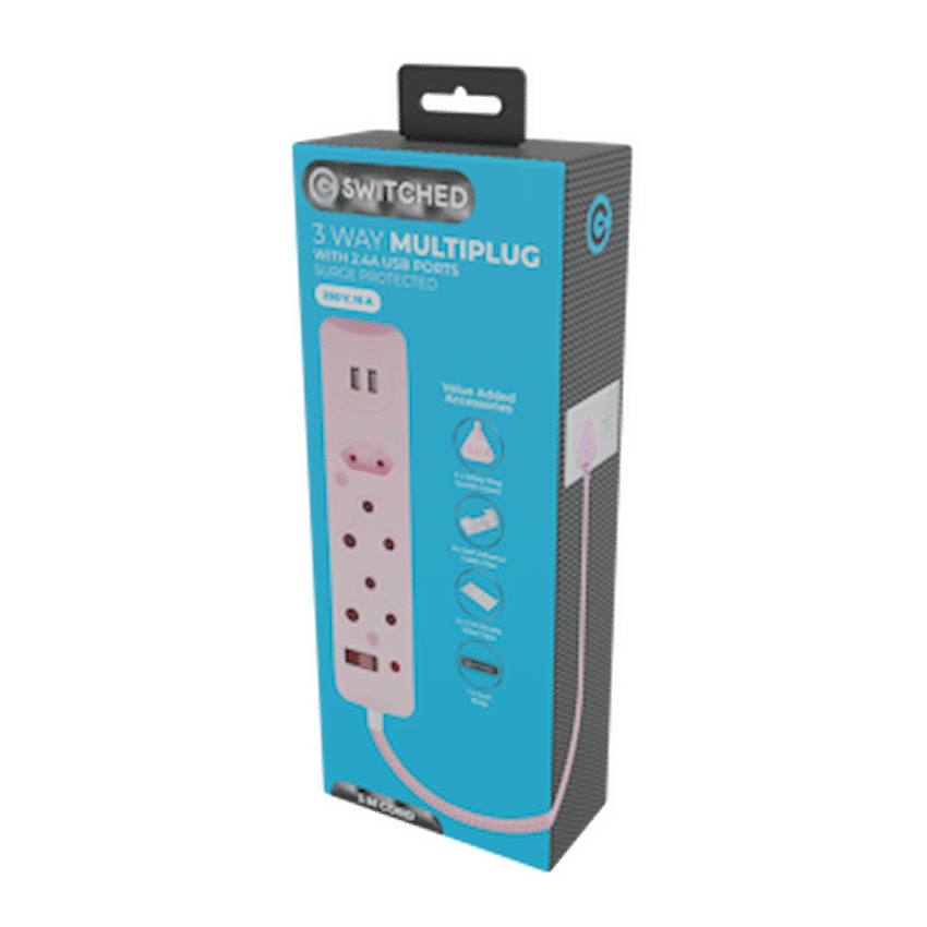 Add safety, functionality, and style to your power setup with the Switched 3-Way Surge Protected Multiplug with Dual USB Ports. Designed for modern living, this USB surge protected multiplug offers the perfect combination of everyday convenience and advanced electrical protection.Equipped with dual 2.4A USB ports, it allows fast and direct charging for smartphones, tablets, and other USB devices-no adapters needed. With 450 J surge protection and an overload reset switch, this surge protection plug with USB ports defends your valuable electronics from voltage spikes and load-shedding surges.The durable 3m braided cable gives you extended reach and tangle-free flexibility, while the vibrant pink finish adds a touch of personality to your space. Whether for your home, office, or vanity setup, this pink power extension delivers both form and function.