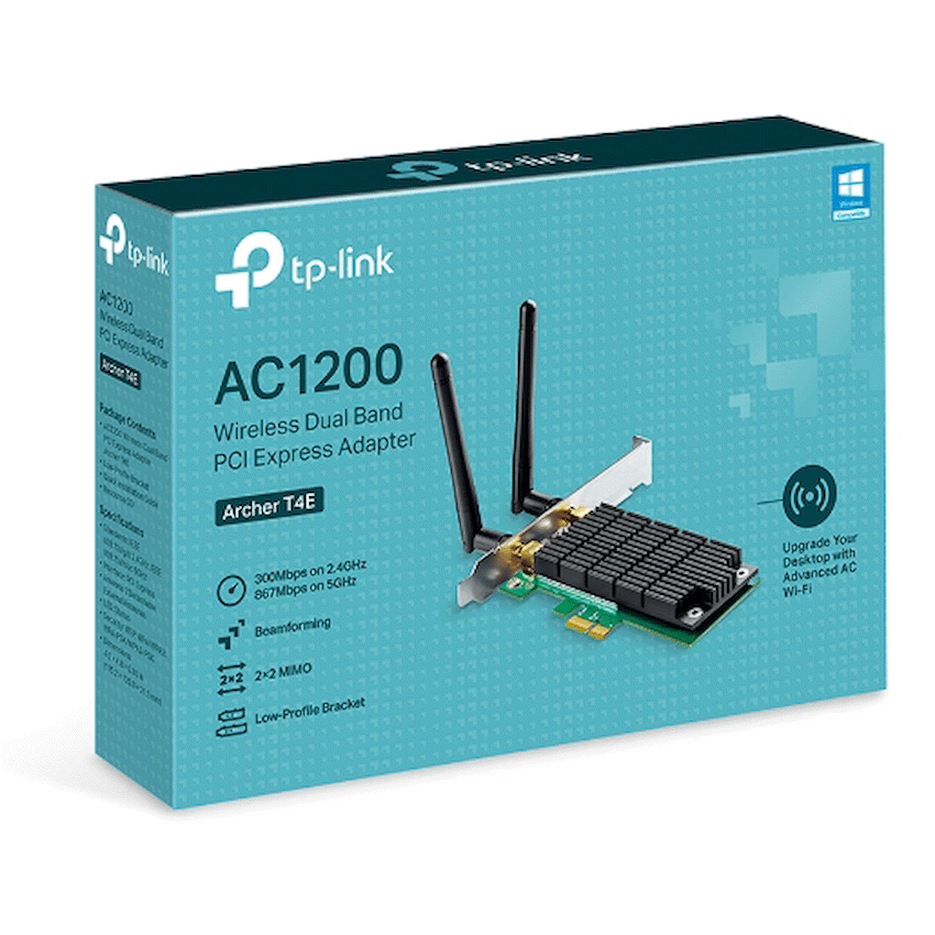 TP-Link Archer T4E AC1200 Wireless Dual Band PCI Express AdapterAC1200 Wireless Dual Band PCI Express AdapterArcher T4EKey FeaturesEasy Installation – Plug the adapter into an available PCI-E slot to upgrade your desktopHigh Speed Wi-Fi – Up to 1200 Mbps Wi-Fi speeds (867 Mbps on 5 GHz band and 300 Mpbs on 2.4 GHz band)802.11ac Dual Band – 3 times faster than the 802.11n standard, perfect for high-intensity network usageBeamforming – Wi-Fi signals are strengthened towards certain direction where client existsMultiple-Size Brackets – Low profile and full heigh brackets are both provided, suitable for all PCs2x2 MIMO – Users can easily access to high-speed wireless connectionBroad Wireless Range – Two external antennas ensure greater Wi-Fi coverage and enhanced stabilityAC1200Wireless Dual BandPCI Express AdapterArcher T4E802.11ac – Dual Band Wi-Fi for Faster ConnectionsTP-LINK’s Archer T4E supports the advanced Wi-Fi standard of IEEE 802.11ac, offering 3 times transferring rates as IEEE 802.11n. You can send emails and browse the web with 2.4GHz network, while keeping the speedy 5GHz band free for gaming, HD streaming and other bandwidth intensive applications.Greater Coverage with BeamformingBeamforming technology smartly focuses Wi-Fi signals towards connected devices for stable connections and boosted range.Heat Sink for Ultimate StabilityA heat sink helps to dissipate the thermal energy generated by the adapter, which in turn improves stability. Additionally, lower temperatures help to extend the product lifespan.External Antennas for More Targeted signalTwo external antennas utilize the latest wireless technology to achieve stable connections and boosted coverage.Easy SetupSimple software installation with the intuitive Utility on the provided CDAdvanced SecurityWAP,WPA/WPA2,WPA-PSK/WPA2-PSK encryption standards ensure your data is safe from intrudersOperating SystemSupports Windows 10/8.1/8/7/XP(32/64 bit)Low-Profile BracketIn addition to the standard bracket, a low-profile bracket is also provided for mini tower computer casesSpecificationsHardware FeaturesInterface : PCI ExpressDimensions ( W x D x H ) : 4.8 x 4.5 x 0.85 in (120.8115.221.5 mm)Antenna Type : 2 Dual Band Detachable AntennasWireless FeaturesWireless Standards : IEEE 802.11ac/n/a 5 GHz , IEEE 802.11n/g/b 2.4 GHzSignal Rate5 GHz11ac: Up to 867 Mbps(dynamic)11n: Up to 300 Mbps(dynamic)11a: Up to 54 Mbps(dynamic)2.4 GHz11n: Up to 300 Mbps(dynamic)11g: Up to 54 Mbps(dynamic)11b: Up to 11 Mbps(dynamic)Reception Sensitivity5 GHz :11ac HT80: -59.5 dBm11ac HT40: -63 dBm11ac HT20: -68 dBm11n HT40: -70 dBm11n HT20: -73 dBm11a 54Mbps: -76 dBm11a 6Mbps: -92 dBm2.4GHz :11n HT40: -67.5 dBm11n HT20: -70 dBm11g 54Mbps: -72 dBm11b 11Mbps: -86.5 dBmTransmit Power : 5 GHz : 24 dBm(FCC) / 23dBm(CE) (EIRP), 2.4 GHz : 25 dBm(FCC) / 20dBm(CE) (EIRP)Wireless Modes : Infrastructure modeWireless Security : Support 64/128 bit WEP, WPA/WAP2, WPA-PSK/WPA2-PSK, 802.1xModulation Technology : DBPSK, DQPSK, CCK, OFDM, 16-QAM, 64-QAM, 256-QAMOthersCertification : CE, FCC, RoHSSystem Requirements : Windows 10/8.1/8/7/XP (32/64bit)Environment : Operating Temperature: 0~40 (32~104)Storage Temperature: -40~70 (-40~158)Operating Humidity: 10%~90% non-condensingStorage Humidity: 5%~90% non-condensingWhat’s in the boxAC1200 Wireless Dual Band PCI Express Adapter Archer T4ELow-Profile BracketQuick Installation GuideResource CD