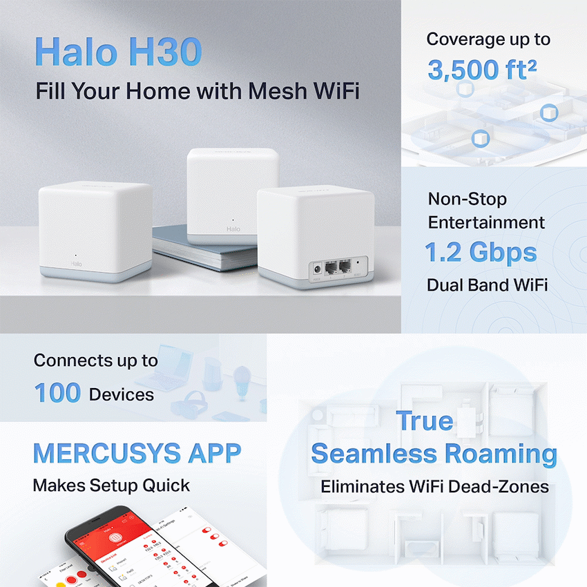 TP-Link Mercusys Halo H30(3-Pack) AC1200 Whole Home Mesh Wi-Fi SystemOne Unified Network – With advanced Mesh Technology, Halo units work together to form a single unified whole home network with one WiFi name and password.Seamless Roaming – Automatically switch between Halos as you move around your home, always getting the best signal to enjoy the fastest connections for all your devices.Whole Home Coverage – Blanket up to 3,500 ft2 (320 m2) with high-speed WiFi, eliminating WiFi dead zones at your home.1.2 Gbps Dual Band WiFi – Halo H30 provides fast and stable connections up to 100 devices with speeds of up to 1,200 Mbps and works with major internet service providers (ISPs) and modems.Easy App Control – Use the MERCUSYS App to quickly set up and manage your WiFi.*Please note that the Halo H series and S series cannot work together.
