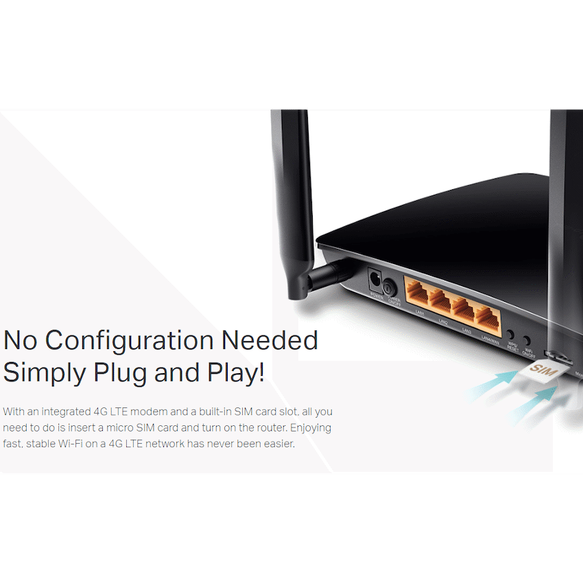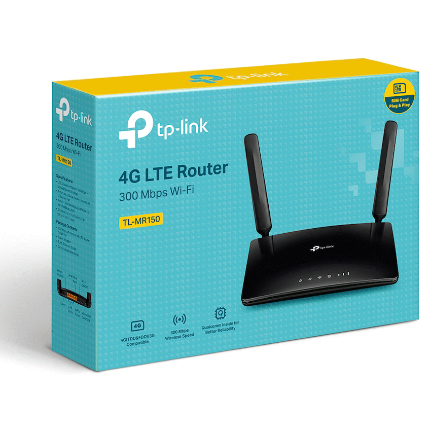 TP-Link TL-MR150 300Mbps Wireless N 4G LTE RouterTL-MR150300Mbps Wireless N 4G LTE RouterCutting-edge 4G network – share internet access with up to 32 Wi-Fi devices and enjoy download speeds of up to 150 MbpsPlug a SIM card and play – no configurations needed, compatibility of SIM cards in 100+ countries are assured by years of field testsTwo detachable advanced LTE antennas – enjoy stable and efficient connections to every device thanks to the two external antennasWi-Fi router mode – plug an Ethernet cable into the LAN/WAN port for flexible access as a backup option if you can’t get a 4G connectionEnjoy Wi-Fi on 4G LTE300 Mbps Wireless N 4G LTE Router – TL-MR150No Configuration Needed Simply Plug and Play!With an integrated 4G LTE modem and a built-in SIM card slot, all you need to do is insert a micro SIM card and turn on the router. Enjoying fast, stable Wi-Fi on a 4G LTE network has never been easier.Share Your 4G LTE NetworkTake full of advantage of your cutting-edge 4G LTE network for download speeds of up to 150 Mbps. Share your 4G LTE network with multiple Wi-Fi devices and enjoy uninterrupted HD movies, rapid file downloads, and smooth video chats. Fully compatible with FDD-LTE and TDD-LTE to work with most service providers worldwide.Wi-Fi Where You Need ItEnjoy unmatched convenience and versatility. Tested in the field for years to ensure universal compatibility with 2 advanced LTE antennas to deliver a smooth connection. Simply plug in a micro SIM card and power on this elegant piece of technology to utilize fast and stable Wi-Fi, whether you’re at home or working remote.Conference RoomRemote AreaTemporary StorePrivate VillaInternet Access forup to 32 Devices simultaneouslyEasily share a 3G/4G connection with up to 32 wireless devices, such as phones, tablets, and laptops, at the same time. 4 LAN ports stand ready to provide internet for wired devices like desktop computers.Easy Setup and ManagementSet up the TL-MR150 in minutes thanks to its intuitive web interface and the powerful Tether app. Tether also lets you manage its network settings from any Android or iOS device, including parental controls and access control.SpecificationsHARDWARE FEATURESInterface : 3 10/100Mbps LAN Ports, 1 10/100Mbps LAN/WAN Port, 1 Micro SIM Card SlotButton : WPS/RESET Button, WiFi ON/OFF Button, POWER ON/OFF ButtonExternal Power Supply : 9V/0.85ADimensions ( W x D x H ) : 7.95 x 5.55 x 1.32 in. (202 x 141 x 33.6 mm)Antenna Type : 2 x Detachable External 4G LTE AntennasWIRELESS FEATURESWireless Standards : IEEE 802.11b, 802.11g, 802.11nFrequency : 2.4 GHzSignal Rate : 300 Mbps at 2.4 GHzReception Sensitivity :11g 54M: -74dBm11n HT20: -71dBm11n HT40: -67dBmTransmit Power : CE: < 20 dBm(2.4 GHz)Wireless Functions : Enable/Disable Wireless Radio, Wireless Schedule, WMM, Wireless StatisticsWAN Failover : YesWireless Security : 64/128-bit WEP, WPA/WPA2, WPA-PSK/WPA2-PSK encryptionsNetwork Type :4G: FDD-LTE Cat4 (800/900/1800/2100/2600MHz),TDD-LTE (1900/2300/2500/2600MHz)3G: DC-HSPA+/HSPA+/HSPA/UMTS (900/2100MHz)SOFTWARE FEATURESOperating Modes : 3G/4G Router, Wireless RouterManagement : Access Control, Local Management, Remote ManagementWAN Connection Type : Dynamic IP/Static IP/PPPoE/PPTP(Dual Access)/L2TP(Dual Access)DHCP : Server, Client, DHCP Client List, Address ReservationPort Forwarding : Virtual Server, Port Triggering, UPnP, DMZDynamic DNS : DynDns, NO-IPVPN : PPTP VPN, IPSec VPN , OpenVPNAccess Control : Parental Controls, Local Management Control, Host List, Access ControlFirewall Security : DoS, SPI Firewall, IP and MAC Address BindingProtocols : IPv4, IPv6Guest Network : 2.4GHz guest networkOTHERSCertification : CE, RoHSSystem Requirements : Microsoft Windows 98SE, NT, 2000, XP, Vista(TM) or Windows 7, 8, 8.1,MAC OS, NetWare, UNIX or Linux Internet Explorer 11, Firefox 12.0, Chrome 20.0, Safari 4.0 browsers or higher, or other Java-enabled browsersMicro SIM CardEnvironment :Operating Temperature: 0~40 (32 ~104)Storage Temperature: -40~70 (-40 ~158)Operating Humidity: 10%~90% non-condensingStorage Humidity: 5%~90% non-condensingThis units does Not support rain 4G Sim CardsWhat's in the box1 x 300Mbps Wireless N 4G LTE Router TL-MR1501 x Power Adapter1 x RJ45 Ethernet Cable1 x Quick Installation Guide