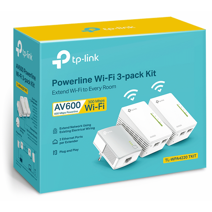 TP-Link TL-WPA4220 TKIT Twin AV600 Powerline Wi-Fi KitExtend wired and wireless network to any room using existing electrical systemOne-Touch Wi-Fi Extension – Wi-Fi Clone Button simplifies your Wi-Fi configuration and helps build a seamless unified home networkHomePlug AV standard providing up to 600 Mbps1 high speed data transmission over a home’s existing electrical wiring, ideal for lag-free HD or 3D video streaming and online gamingExtend 300 Mbps wireless connections to previously hard-to-reach areas of your home and officeTwo fast Ethernet ports of every extender enable TL-WPA4220 to run multiple high-speed and reliable wired connections for devices*TL-WPA4220T KIT contains TL-WPA4220 x 2 and TL-PA4010 x 1